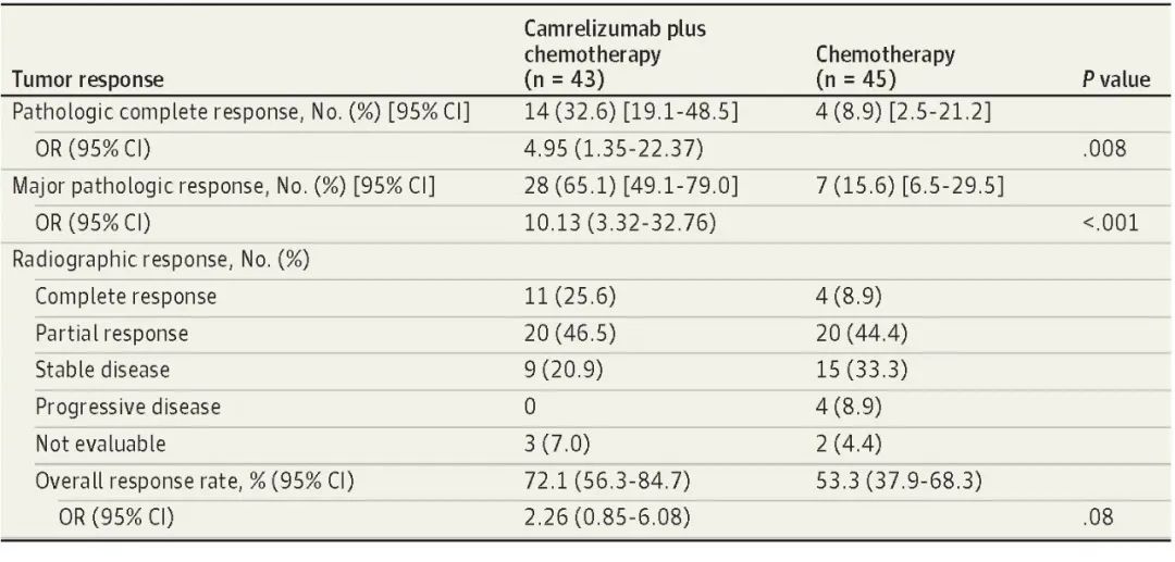 北京时间8月3日,AG亚娱医药创新药卡瑞利珠单抗联合化疗(Cam+CT)对比化疗(CT)新辅助治疗ⅢA/ⅢB (T3N2) 期非小细胞肺癌(NSCLC)结果在线发表于国际权威期刊JAMA Oncology[1]。该研究是由空军军医大学唐都医院姜涛教授、雷杰教授团队联合陕西省肿瘤医院雷光焰教授团队、兰州大学第二附属医院王成教授团队共同参与的一项随机对照、多中心、Ⅱ期临床研究(TD-FOREKNOW,NCT04338620)。研究结果显示,与化疗相比,卡瑞利珠单抗联合化疗新辅助治疗NSCLC显著提高了病理完全缓解(pCR)率(32.6% vs 8.9%,OR=4.95,95% CI :1.35-22.37, P =0 .008),且安全性良好。本研究是卡瑞利珠单抗新辅助治疗可切除NSCLC患者的首个随机对照研究,为NSCLC新辅助免疫治疗再添新证。