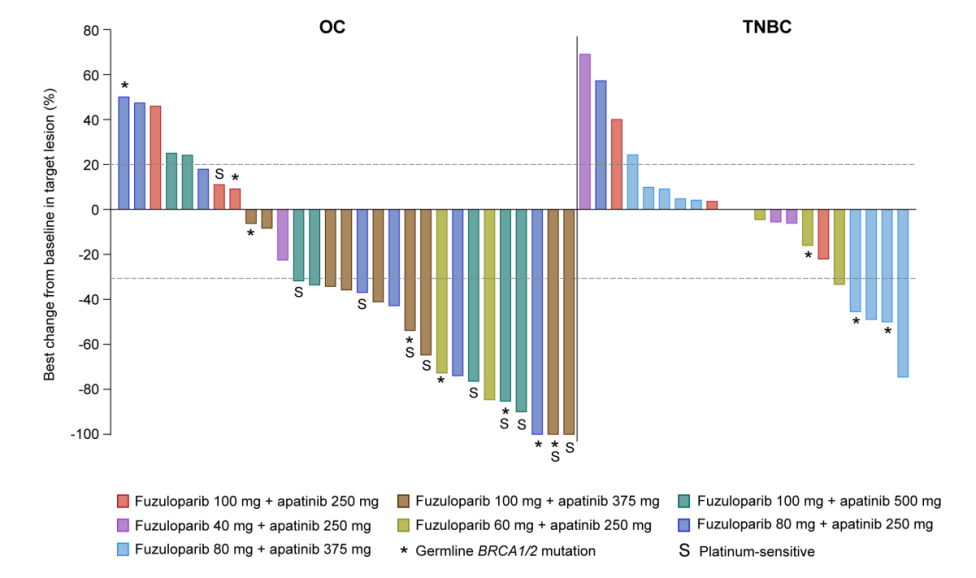 在复发性卵巢癌和三阴性乳腺癌患者中,氟唑帕利联合阿帕替尼安全性可控,对晚期卵巢癌和三阴性乳腺癌具有良好的抗肿瘤活性,为无法耐受细胞毒性治疗的患者带来新的治疗选择。