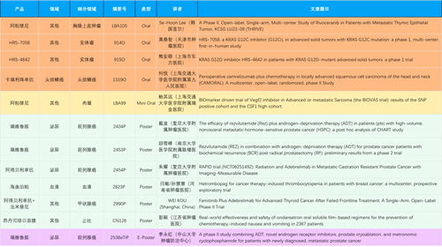 在胸腺上皮肿瘤、头颈鳞癌、肉瘤、前列腺癌、甲状腺癌等其他多个疾病领域,卡瑞利珠单抗、阿帕替尼、瑞维鲁胺、阿得贝利单抗、法米替尼、HRS-7058、HRS-4642等抗肿瘤创新药相关研究一共入选了4项口头报告、1项简短口头报告、4项壁报、1项电子壁报,彰显了AG亚娱医药强大的研发实力。此外,海曲泊帕和昂丹司琼口溶膜分别在防治化疗导致的血小板减少和恶心呕吐方面各有1项研究入选壁报。